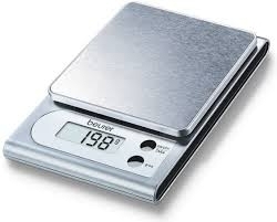 Moderno diseño tipo sándwich Pequeña y manejable Pantalla LCD de fácil lectura Tamaño: 11,5 x 17 x 2,7 cm Superficie de pesaje de acero inoxidable cepillado Tamaño de los números: 15 mm Precisión de 1 g 3 kg de capacidad Cambio de g/oz Incluye pila Función de desconexión automática